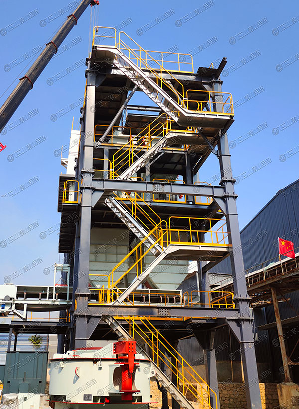 這套V9-150制砂樓,總投料量為150噸,整條生產(chǎn)線設(shè)備選型為:制砂選粉一體機、空氣篩、粗細粉分離機等。