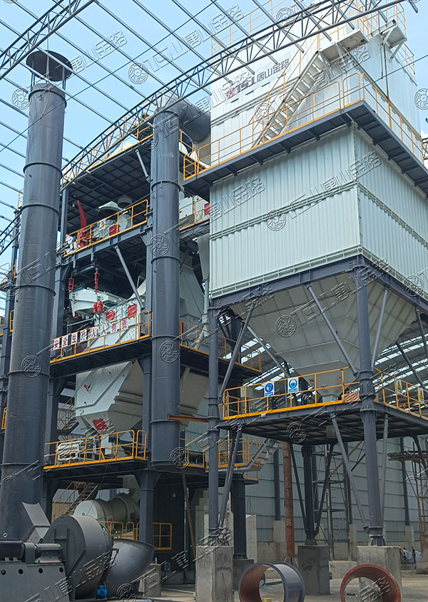 原料經(jīng)過電子秤進入到皮帶輸送機中,由全封閉的提升機將物料入到五孔碾磨制砂機內(nèi)進行破碎處理,再由空氣篩對破碎后的物料進行篩分、選粉處理,篩分后的較大物料會返回五孔碾磨制砂機中進行二次破碎,符合要求的砂子則經(jīng)加濕拌合機處理后由傳送帶輸送至成品倉中;篩分過程中的粉塵會經(jīng)粗細(xì)粉分離機進入到布袋收塵器內(nèi),而其中較大的粗顆粒會在粗細(xì)粉分離機的作用下,按需求在成品砂中進行回?fù)?,?xì)粉塵將通過風(fēng)力進入到布袋收塵器,作為副產(chǎn)品進行使用。